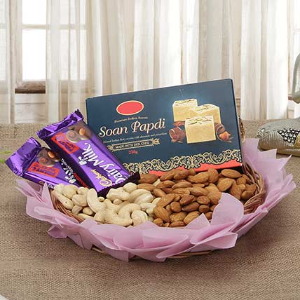 Dry fruits, chocolates, and soan papdi of 200gms (100gms each of almonds and cashews), 38gms, and 250gms respectively are here for wishing your friends and relatives a very happy Diwali.