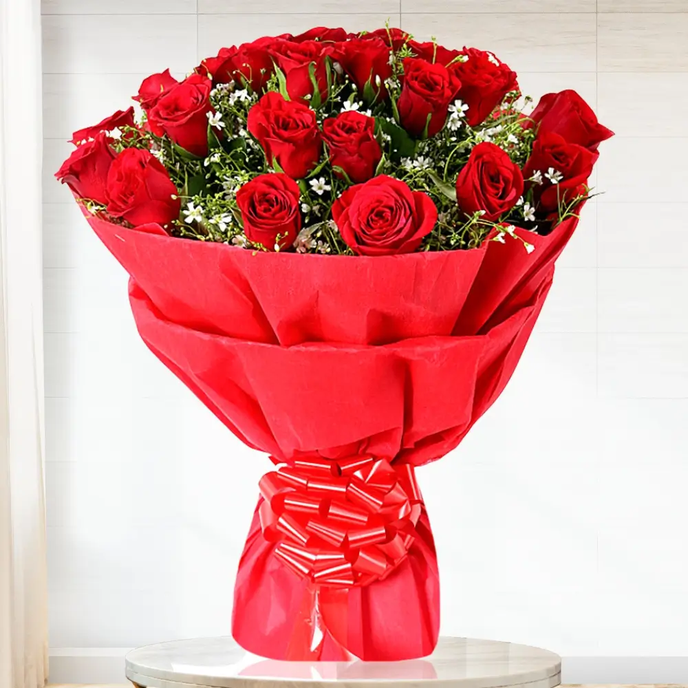 Bunch of 25 red roses with green fillers in red wrapping with red ribbon
