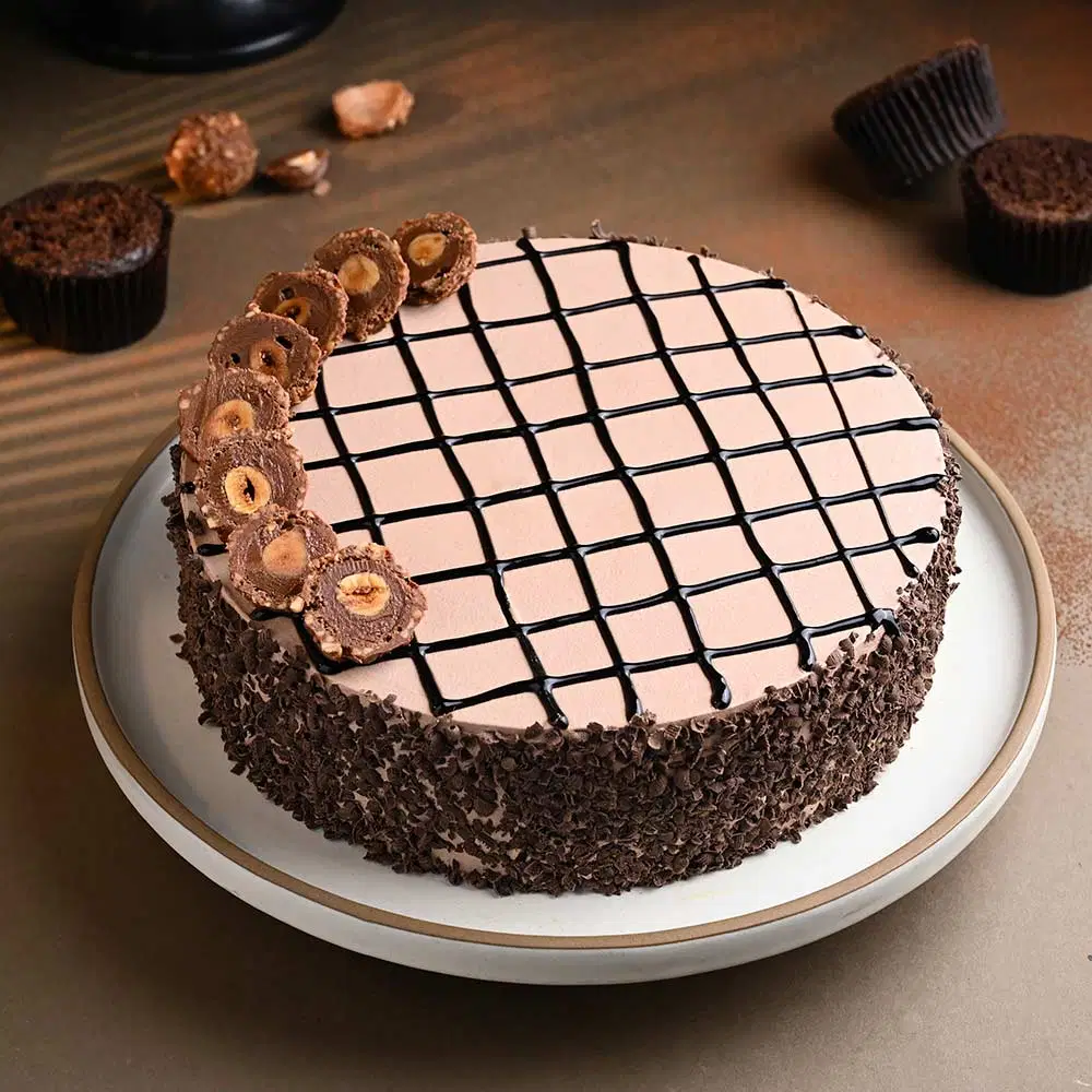 Coated with chocolate cream, this chocolate cake is topped with Ferrero Rochers, hazelnuts & chocolate syrup.