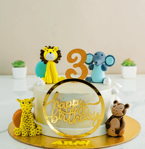 A jungle theme cake with animals on top and around and crown based 1 in centre and a topper in front