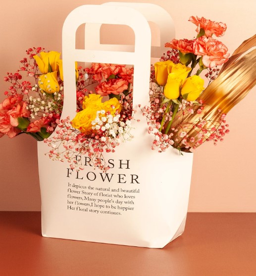 Yellow Roses and Peach Carnations with fillers and a touch of gold arranged in a Paper Bag