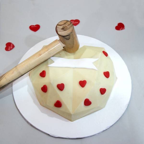 – Half Kg Heart Shape White Chocolate Pinata Cake with 3 Kitkat (13.2gm), 3 Dairy Milk (13.2 gm),2 Five Star (22gm) and 4 pc Ferrero Rocher Chocolate.