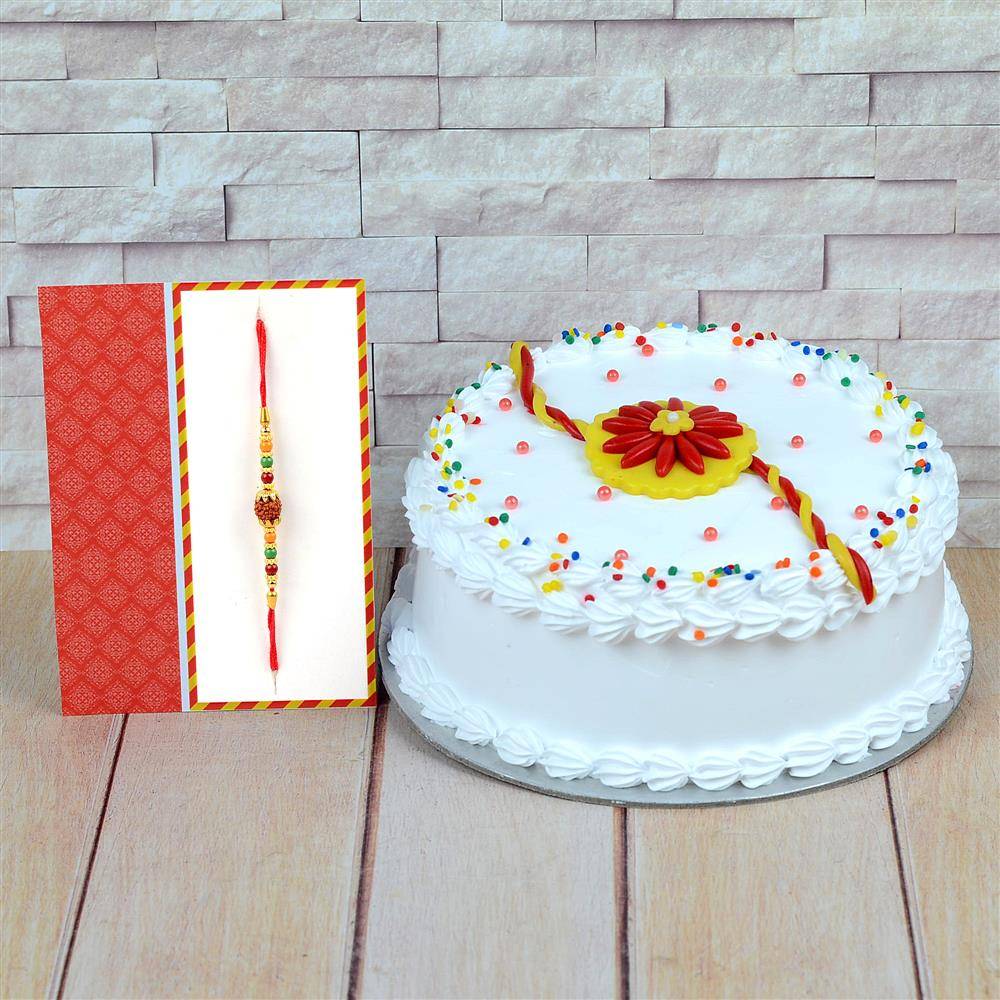 This exquisite Rakhi combo gift comprises of:One Beautiful RakhiHalf Kg Vanilla CakeNote: The photos are indicative only. Actual design and combo might differ based on chef, seasonal elements and ingredient availability.
