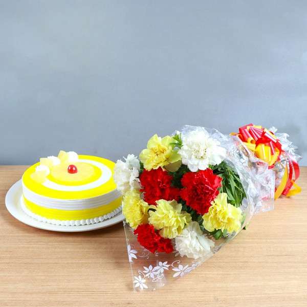 – One Bouquet of 10 Mixed Carnations (4 Yellow,3 Red and 3 White) in Cellophane Packing
