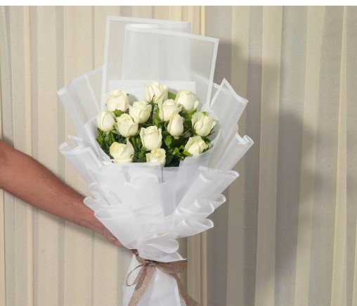White Roses hand tied in a white wrap.